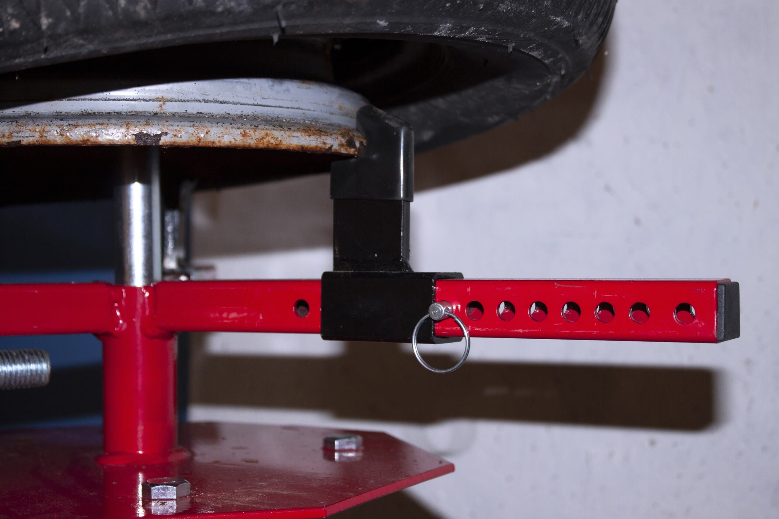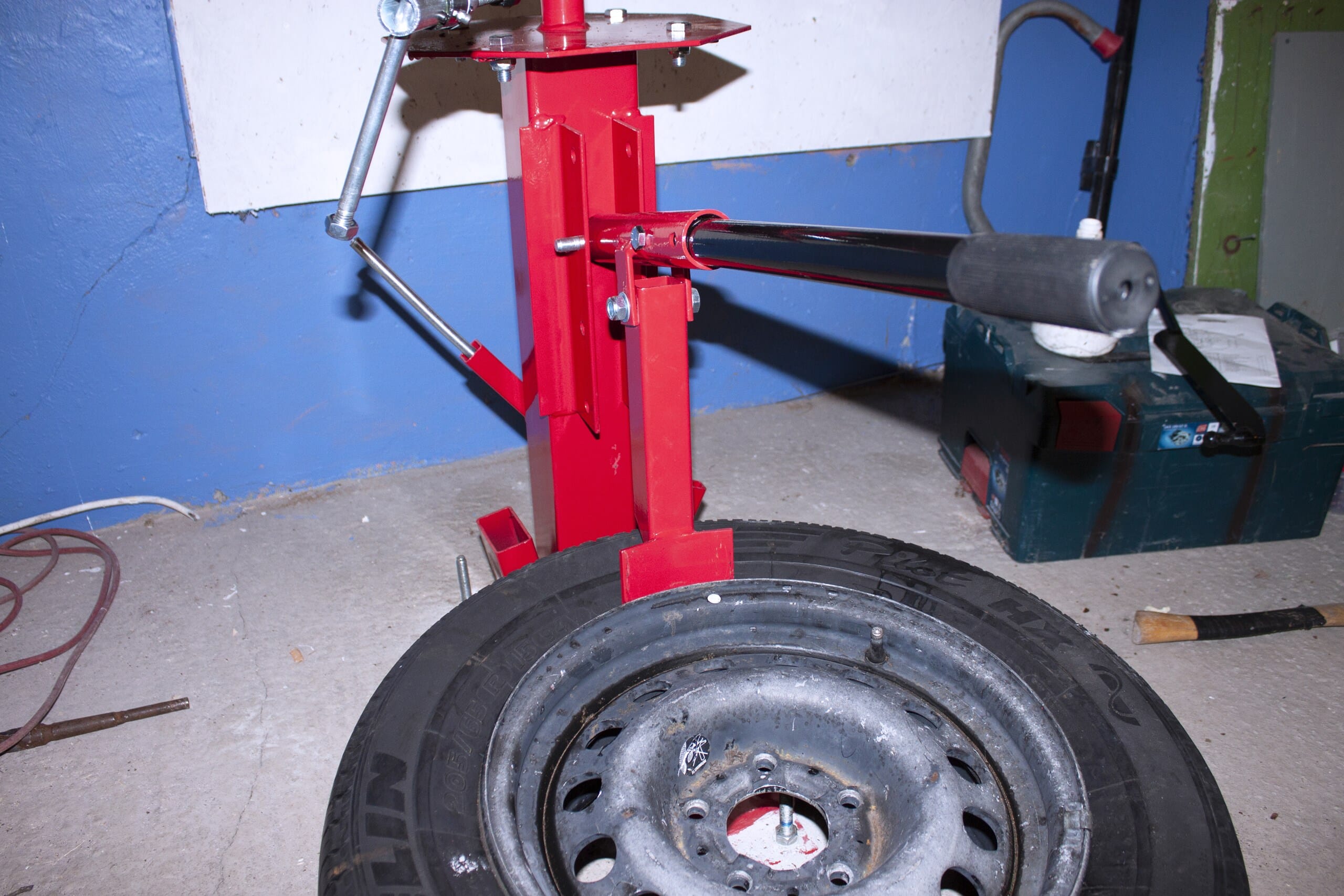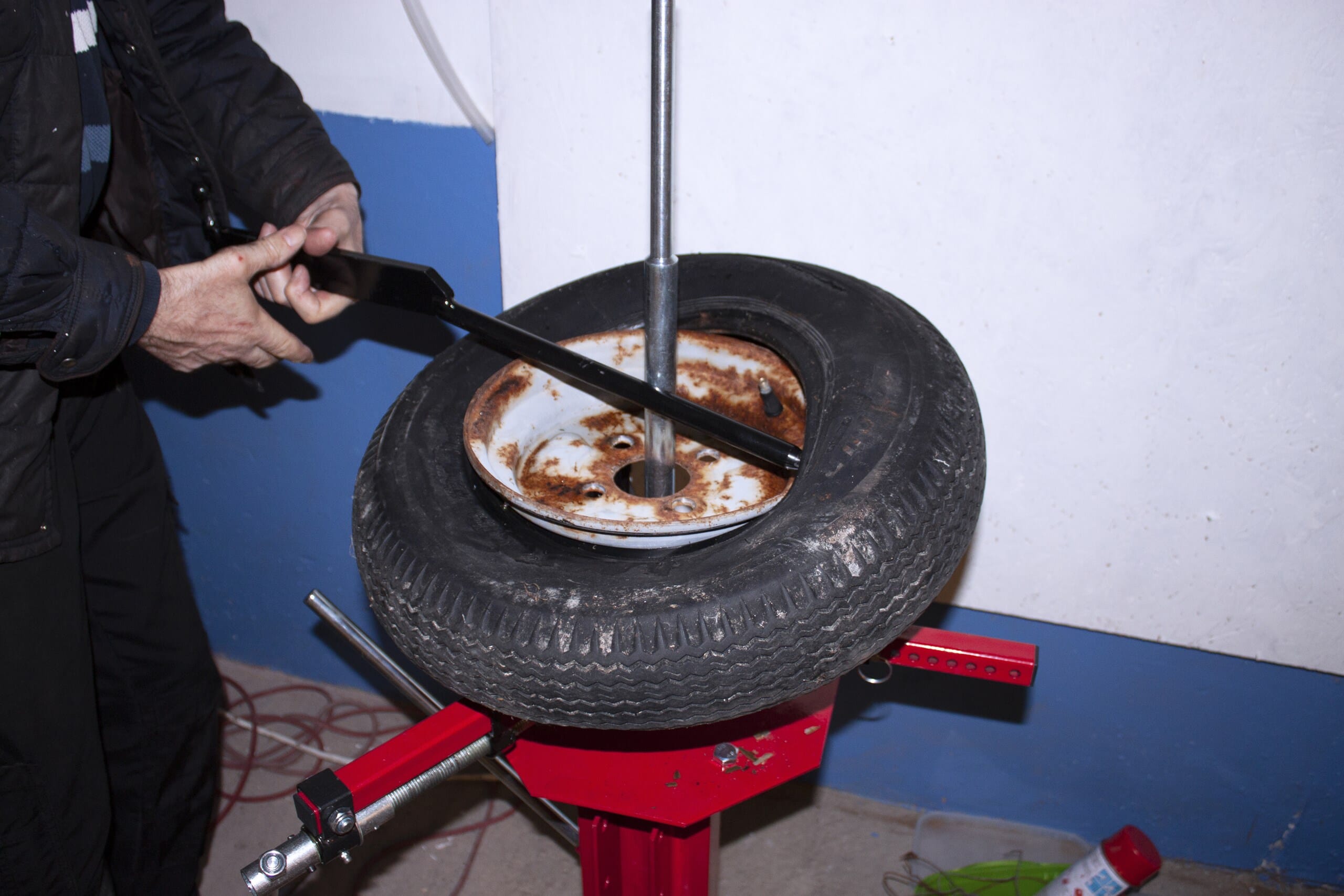 Av og på montering av dekket gjøres på den øverste "seksjonen" Medfølgende verktøy fungerer her utmerket på ATV dekk og tilhengerhjul.