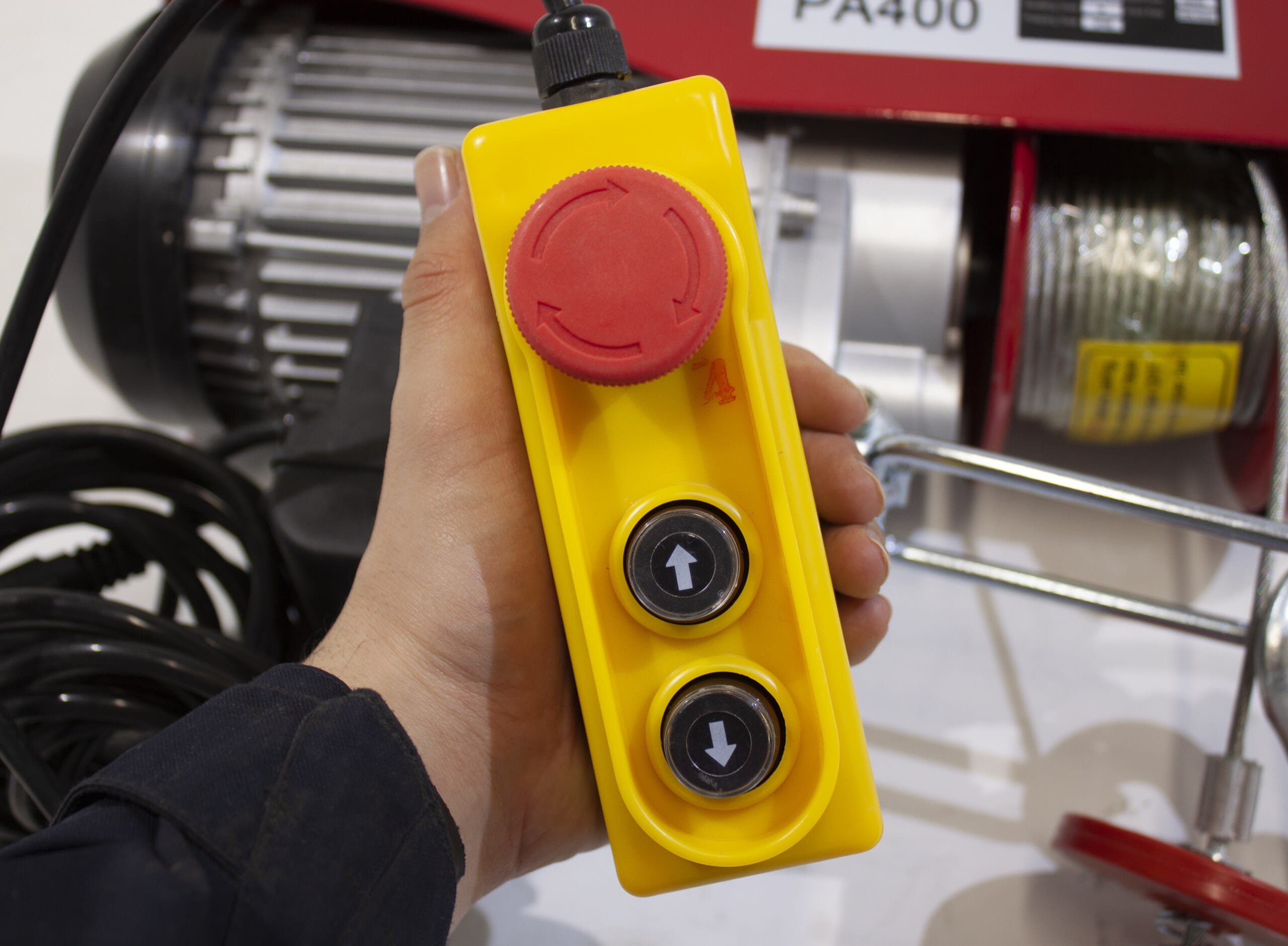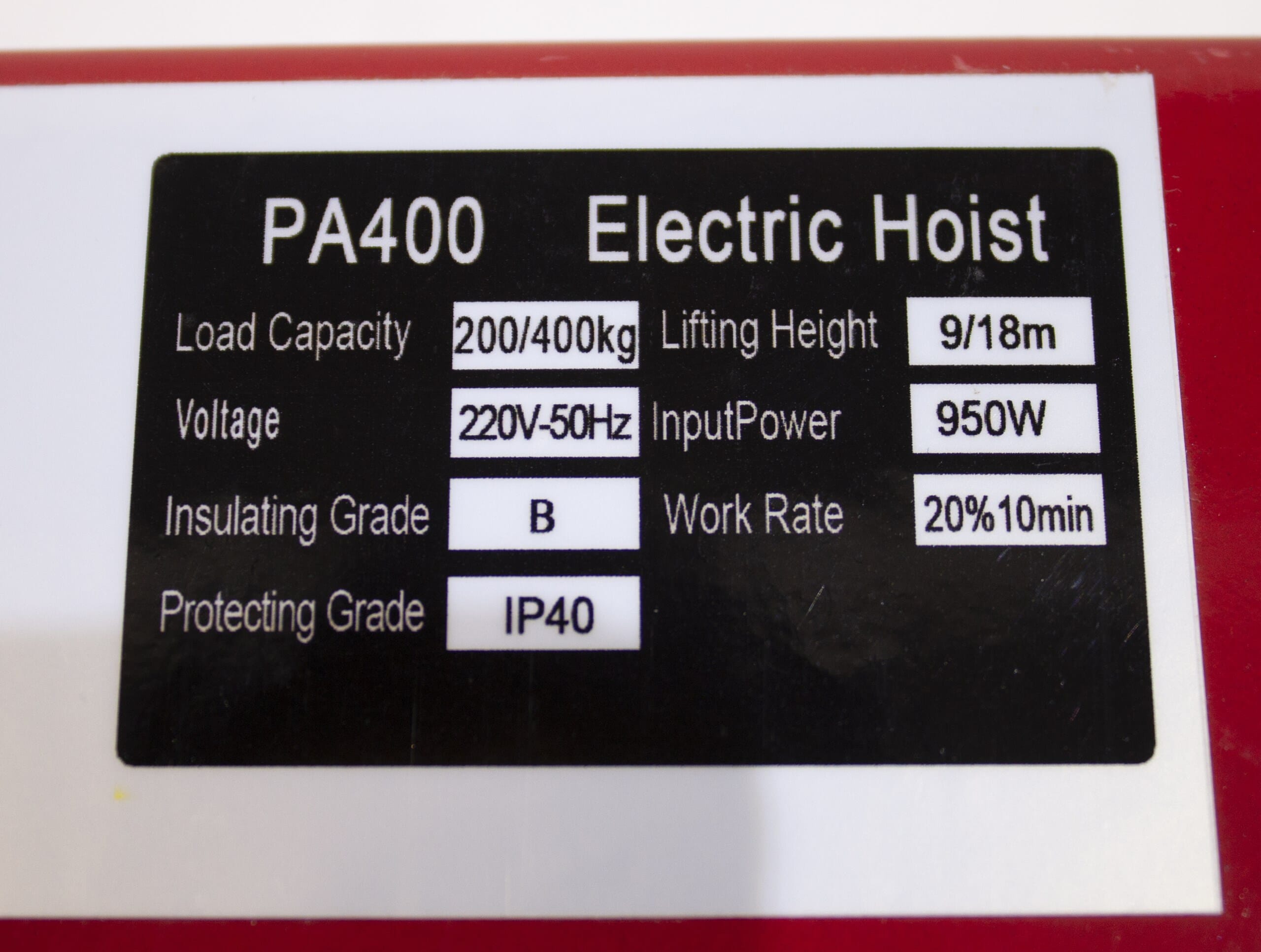 God 220 volt vinsj, som er godkjent for løft inntil 400 kg på dobbel wire.